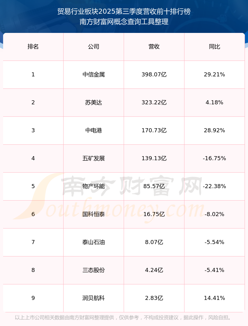 按照南方财富网概念查询工具统计,该股所属板块为贸易行业板块,该板块共有9只股票,廊坊发展2025第三季度营收在该板块中排名为第9名,该板块2025第三季度营收排名前十的股票如下表: