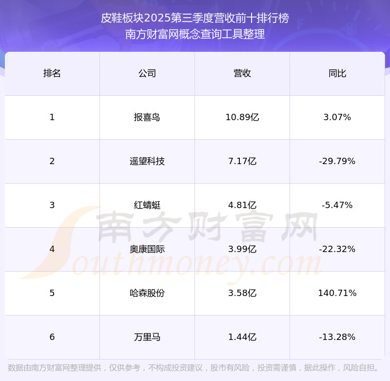 按照南方财富网概念查询工具统计,该股所属板块为皮鞋板块,该板块共有6只股票,红蜻蜓2025第三季度营收在该板块中排名为第3名,该板块2025第三季度营收排名前十的股票如下表: