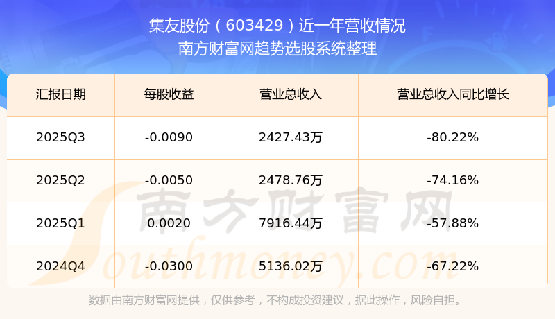 集友股份2025年第三季度显示,公司主营收入2427.43万元,同比-80.22%;归母净利润-458.75万元,同比-130.14%;扣非净利润-718.48万元,同比-153.36%;