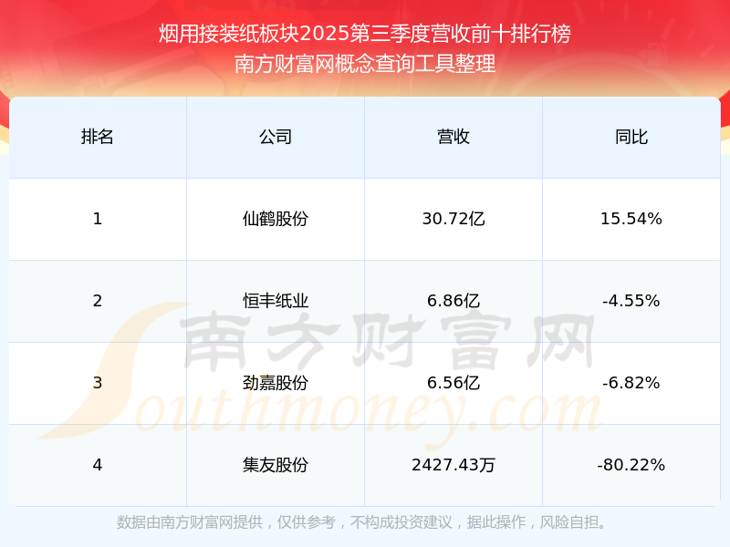 按照南方财富网概念查询工具统计,该股所属板块为烟用接装纸板块,该板块共有4只股票,集友股份2025第三季度营收在该板块中排名为第4名,该板块2025第三季度营收排名前十的股票如下表: