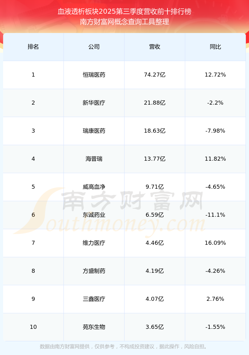 按照南方财富网概念查询工具统计,该股所属板块为血液透析板块,该板块共有13只股票,威高血净2025第三季度营收在该板块中排名为第5名,该板块2025第三季度营收排名前十的股票如下表: