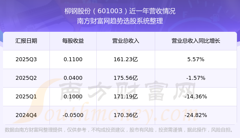 柳钢股份2025年第三季度显示,公司主营收入161.23亿元,同比5.57%;归母净利润2.92亿元,同比180.63%;扣非净利润2.84亿元,同比175.08%。