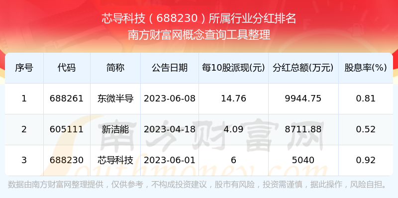 按照南方财富网趋势选股系统统计,芯导科技所属行业为功率器件行业,功率器件行业分红排名情况如下表: