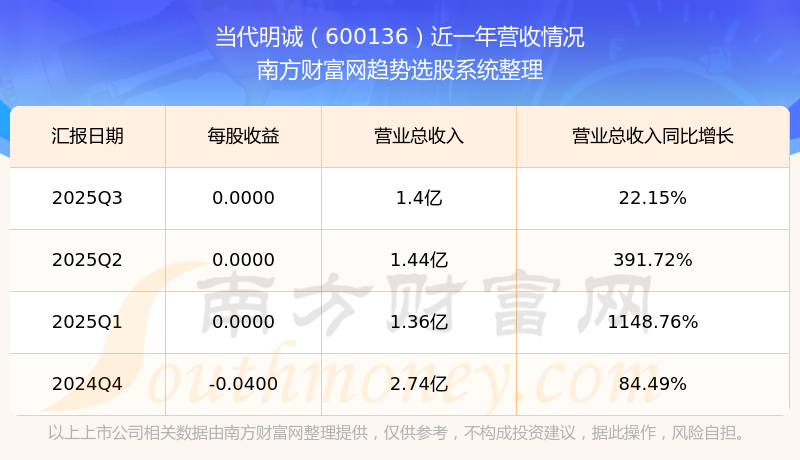当代明诚(600136)发布2025年第三季度财报。2025年第三季度当代明诚实现营业收入1.4亿元,同比增加22.15元%,环比增加-2.76%;净利润为-743.91万元,同比增长-8.34%,环比增长-77.95%。