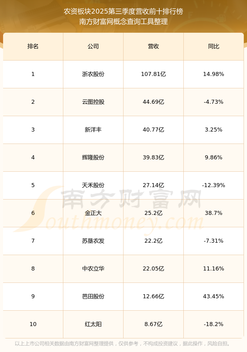 按照南方财富网概念查询工具统计,该股所属板块为农资板块,该板块共有16只股票,苏垦农发2025第三季度营收在该板块中排名为第7名,该板块2025第三季度营收排名前十的股票如下表: