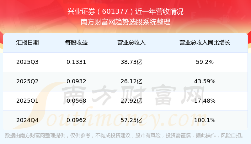 兴业证券股票近一年营收情况如下表: