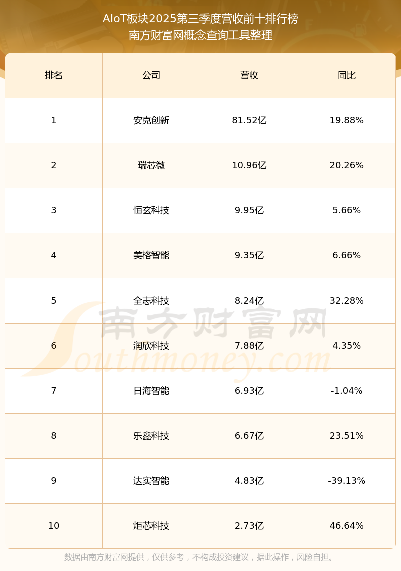 按照南方财富网概念查询工具统计,该股所属板块为AIoT板块,该板块共有11只股票,龙旗科技2025第三季度营收在该板块中排名为第11名,该板块2025第三季度营收排名前十的股票如下表: