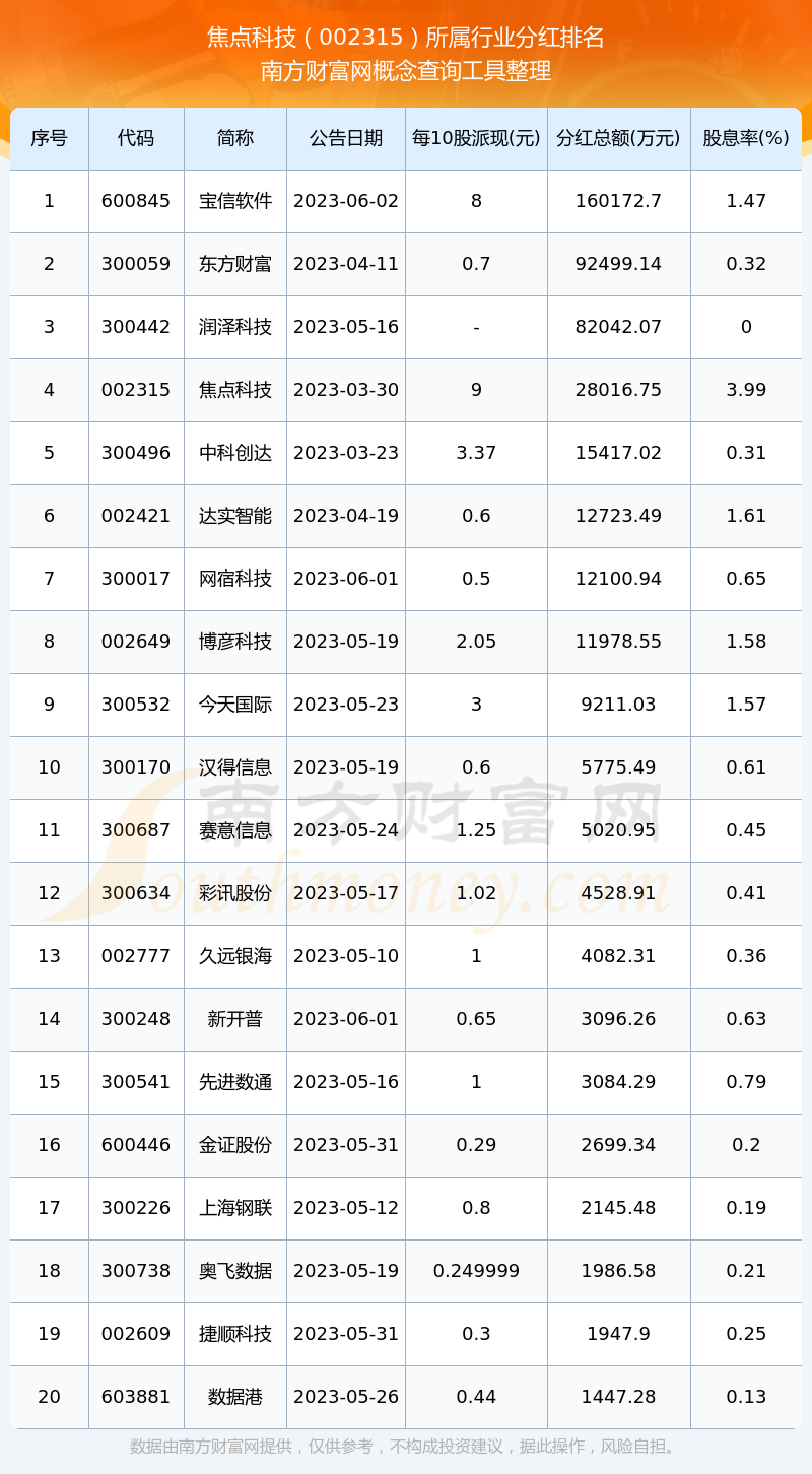 按照南方财富网趋势选股系统统计,焦点科技所属行业为互联网服务行业,互联网服务行业分红排名情况如下表:
