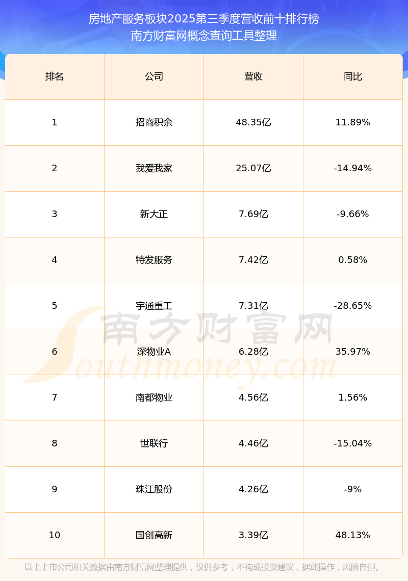 按照南方财富网概念查询工具统计,该股所属板块为房地产服务板块,该板块共有11只股票,北辰实业2025第三季度营收在该板块中排名为第11名,该板块2025第三季度营收排名前十的股票如下表:
