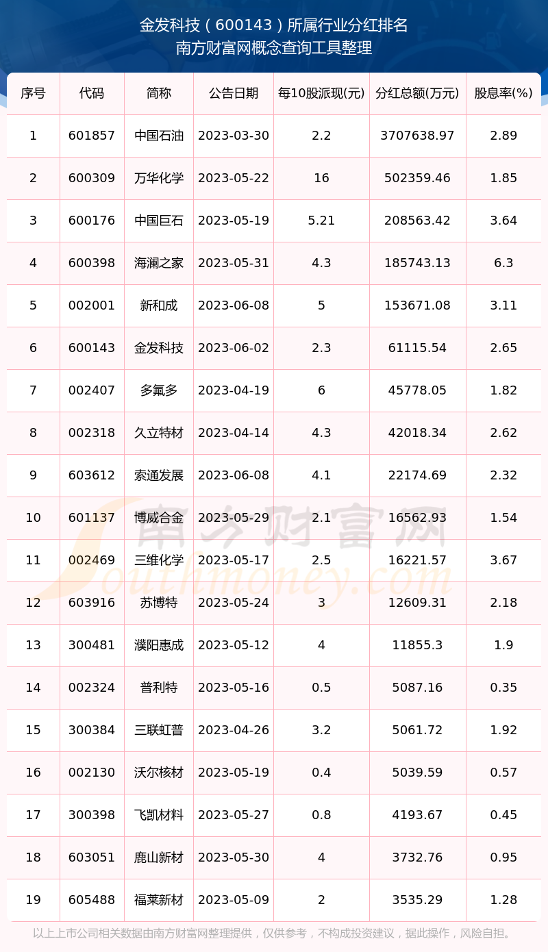 按照南方财富网趋势选股系统统计,金发科技所属行业为改性塑料行业,改性塑料行业分红排名情况如下表: