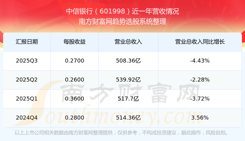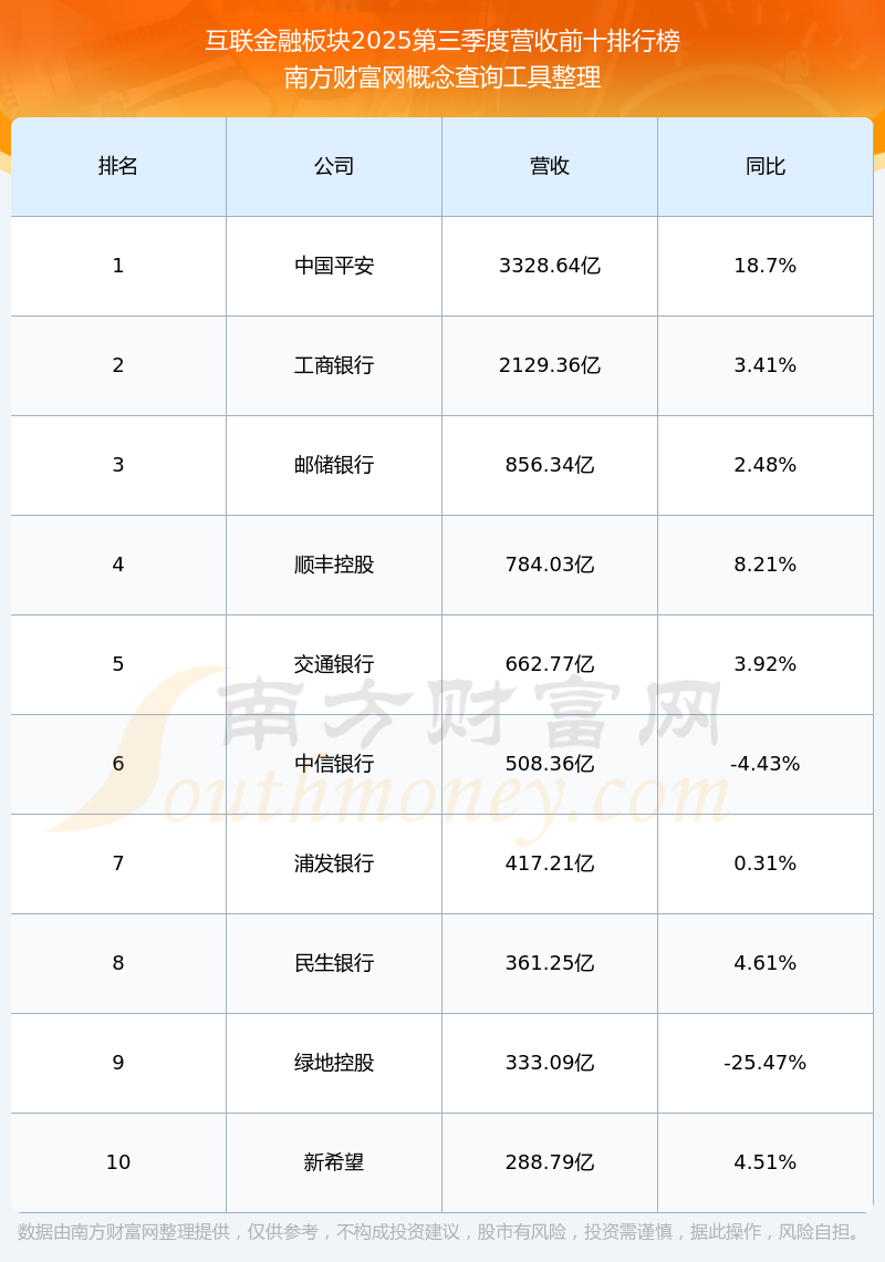 按照南方财富网概念查询工具统计,该股所属板块为互联金融板块,该板块共有238只股票,中信银行2025第三季度营收在该板块中排名为第6名,该板块2025第三季度营收排名前十的股票如下表: