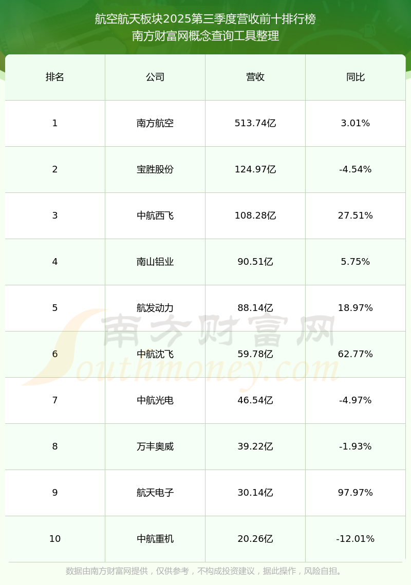 按照南方财富网概念查询工具统计,该股所属板块为航空航天板块,该板块共有70只股票,航天环宇2025第三季度营收在该板块中排名为第70名,该板块2025第三季度营收排名前十的股票如下表: