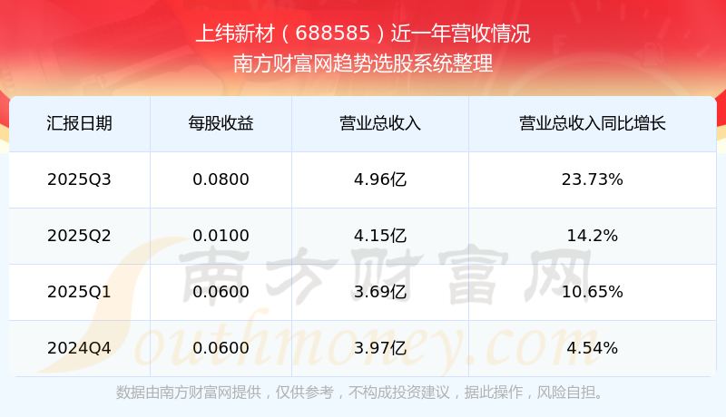 上纬新材(688585)披露2025年第三季度报告,报告期实现营收4.96亿元,同比23.73%;归母净利润3064.73万元,同比49.66%;扣非净利润2859.9万元,同比55.83%。