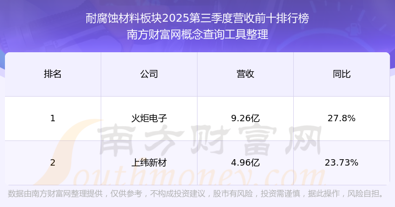 按照南方财富网概念查询工具统计,该股所属板块为耐腐蚀材料板块,该板块共有2只股票,上纬新材2025第三季度营收在该板块中排名为第2名,该板块2025第三季度营收排名前十的股票如下表:
