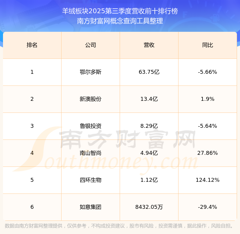 按照南方财富网概念查询工具统计,该股所属板块为羊绒板块,该板块共有6只股票,新澳股份2025第三季度营收在该板块中排名为第2名,该板块2025第三季度营收排名前十的股票如下表: