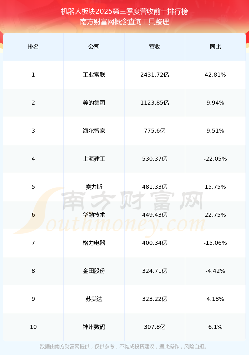 按照南方财富网概念查询工具统计,该股所属板块为机器人板块,该板块共有780只股票,亿嘉和2025第三季度营收在该板块中排名为第728名,该板块2025第三季度营收排名前十的股票如下表: