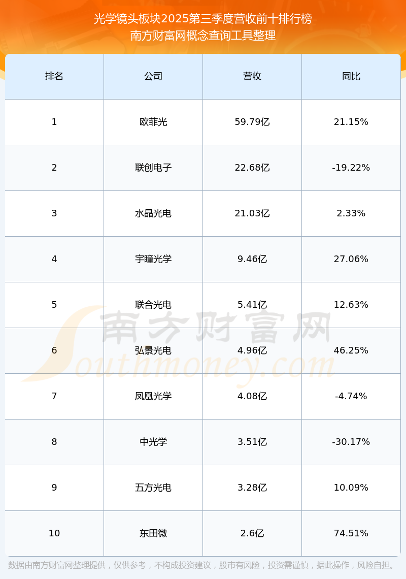 按照南方财富网概念查询工具统计,该股所属板块为光学镜头板块,该板块共有19只股票,福光股份2025第三季度营收在该板块中排名为第15名,该板块2025第三季度营收排名前十的股票如下表: