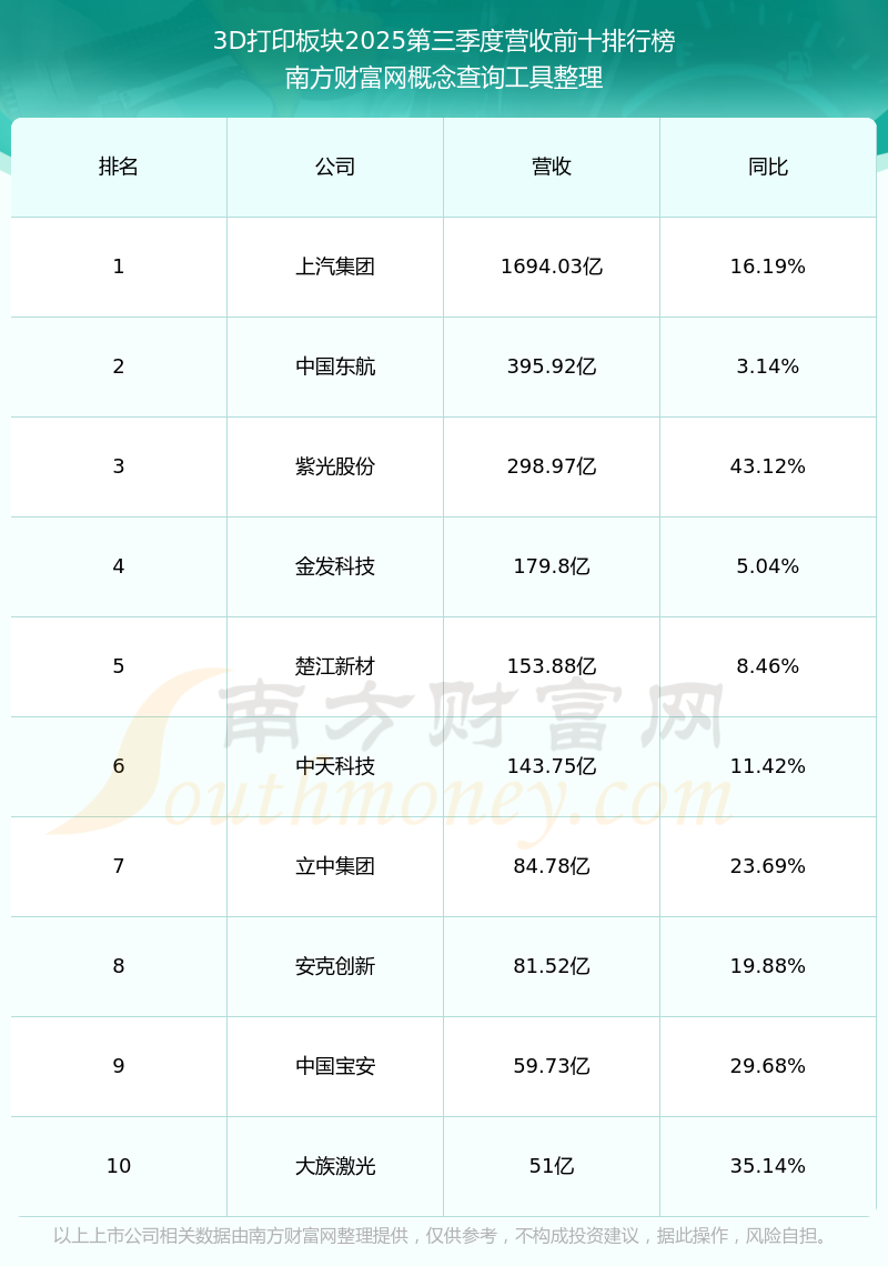 按照南方财富网概念查询工具统计,该股所属板块为3D打印板块,该板块共有132只股票,华曙高科2025第三季度营收在该板块中排名为第103名,该板块2025第三季度营收排名前十的股票如下表:
