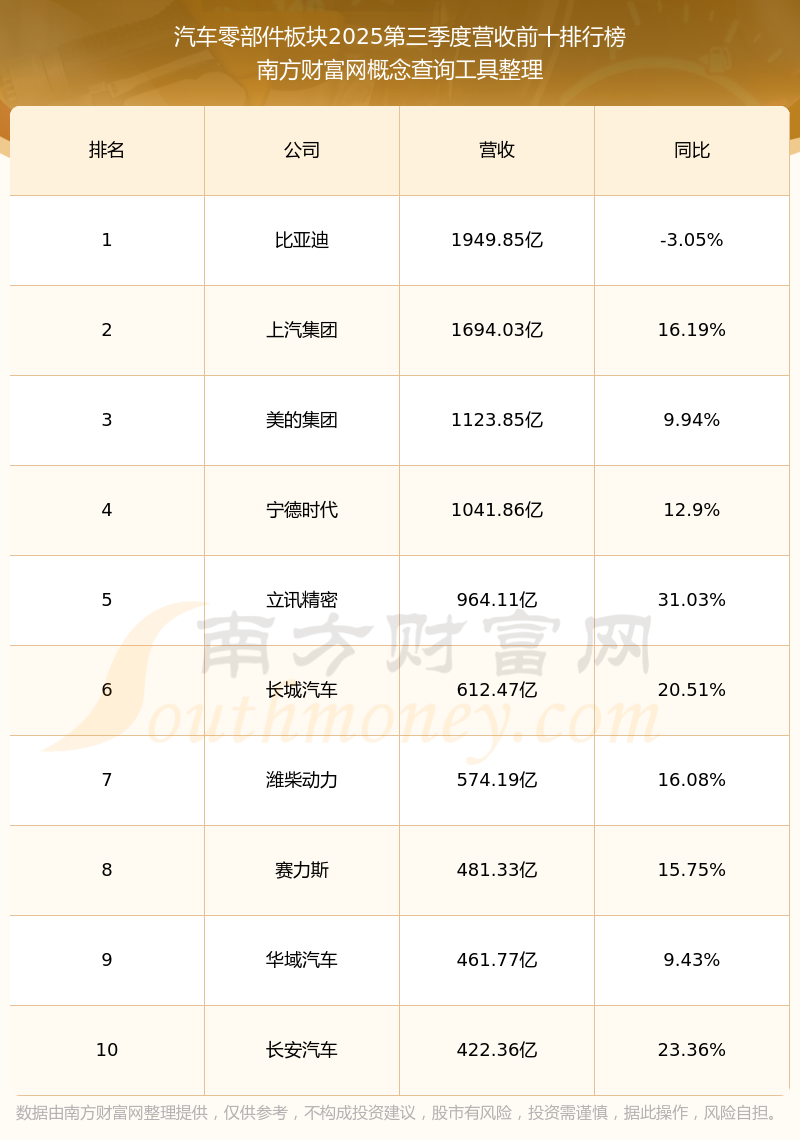 按照南方财富网概念查询工具统计,该股所属板块为汽车零部件板块,该板块共有570只股票,上汽集团2025第三季度营收在该板块中排名为第2名,该板块2025第三季度营收排名前十的股票如下表: