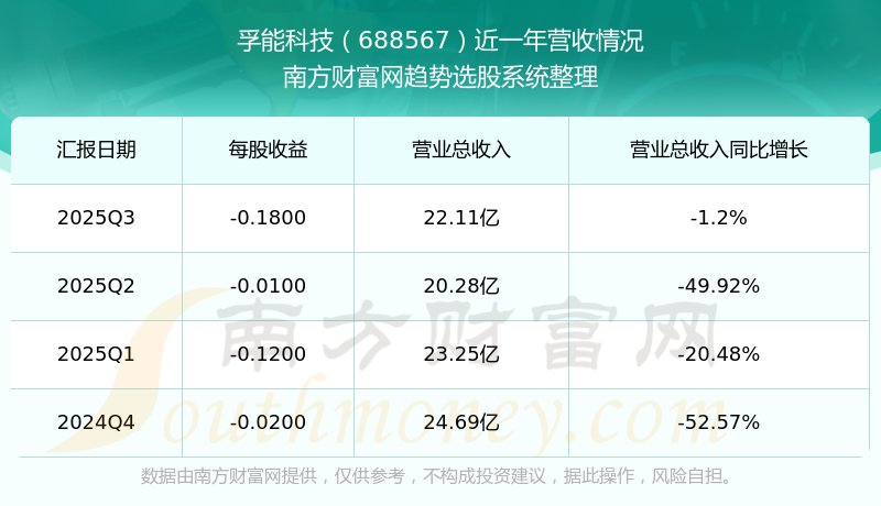 于2025年第三季度,孚能科技披露了其业绩表现,其中主营业务收入22.11亿元,相较于去年同期-1.2%。此外,公司归属于母公司的净利润为-2.24亿元,同比增长了-97.06%。在扣除所有非经常性损益后,净利润-2.3亿元,同比增长-63.22%。