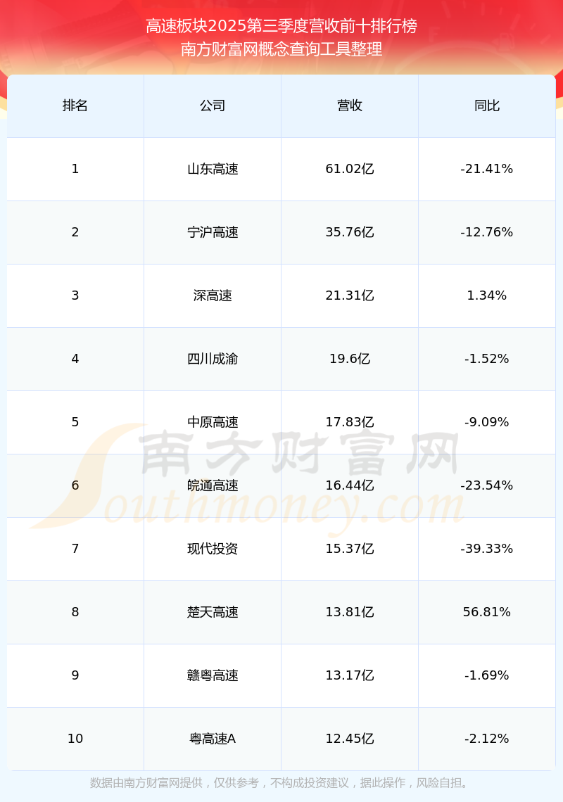 按照南方财富网概念查询工具统计,该股所属板块为高速板块,该板块共有15只股票,中原高速2025第三季度营收在该板块中排名为第5名,该板块2025第三季度营收排名前十的股票如下表: