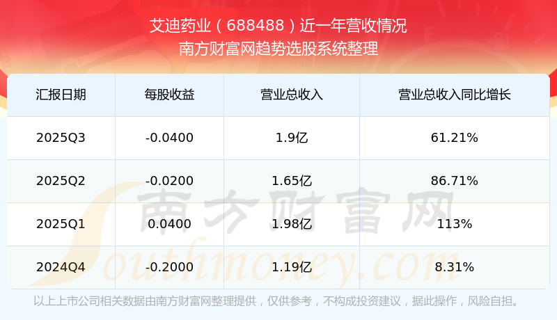 2025年第三季度,艾迪药业营收同比61.21%,净利润同比-3.38%。