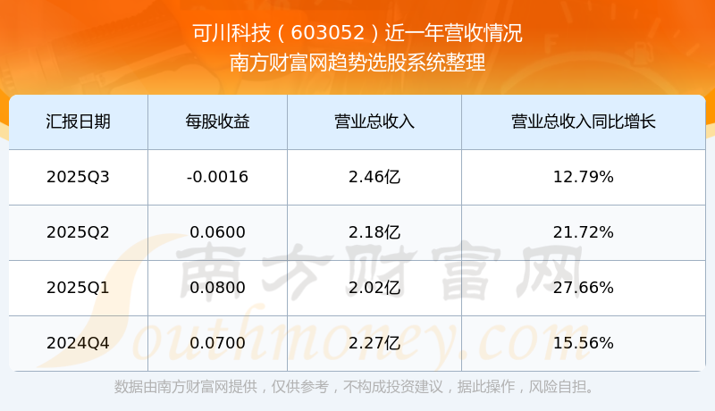 2025年第三季度,可川科技营收同比12.79%,净利润同比-101.43%。