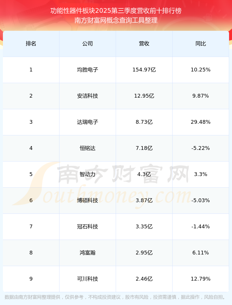 按照南方财富网概念查询工具统计,该股所属板块为功能性器件板块,该板块共有9只股票,可川科技2025第三季度营收在该板块中排名为第9名,该板块2025第三季度营收排名前十的股票如下表: