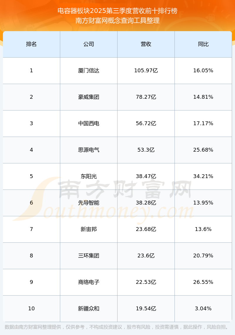 按照南方财富网概念查询工具统计,该股所属板块为电容器板块,该板块共有40只股票,法拉电子2025第三季度营收在该板块中排名为第13名,该板块2025第三季度营收排名前十的股票如下表: