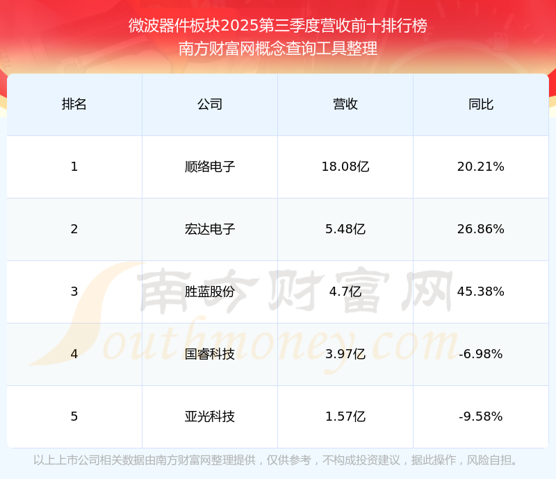 按照南方财富网概念查询工具统计,该股所属板块为微波器件板块,该板块共有5只股票,国光电气2025第三季度营收在该板块中排名为第5名,该板块2025第三季度营收排名前十的股票如下表: