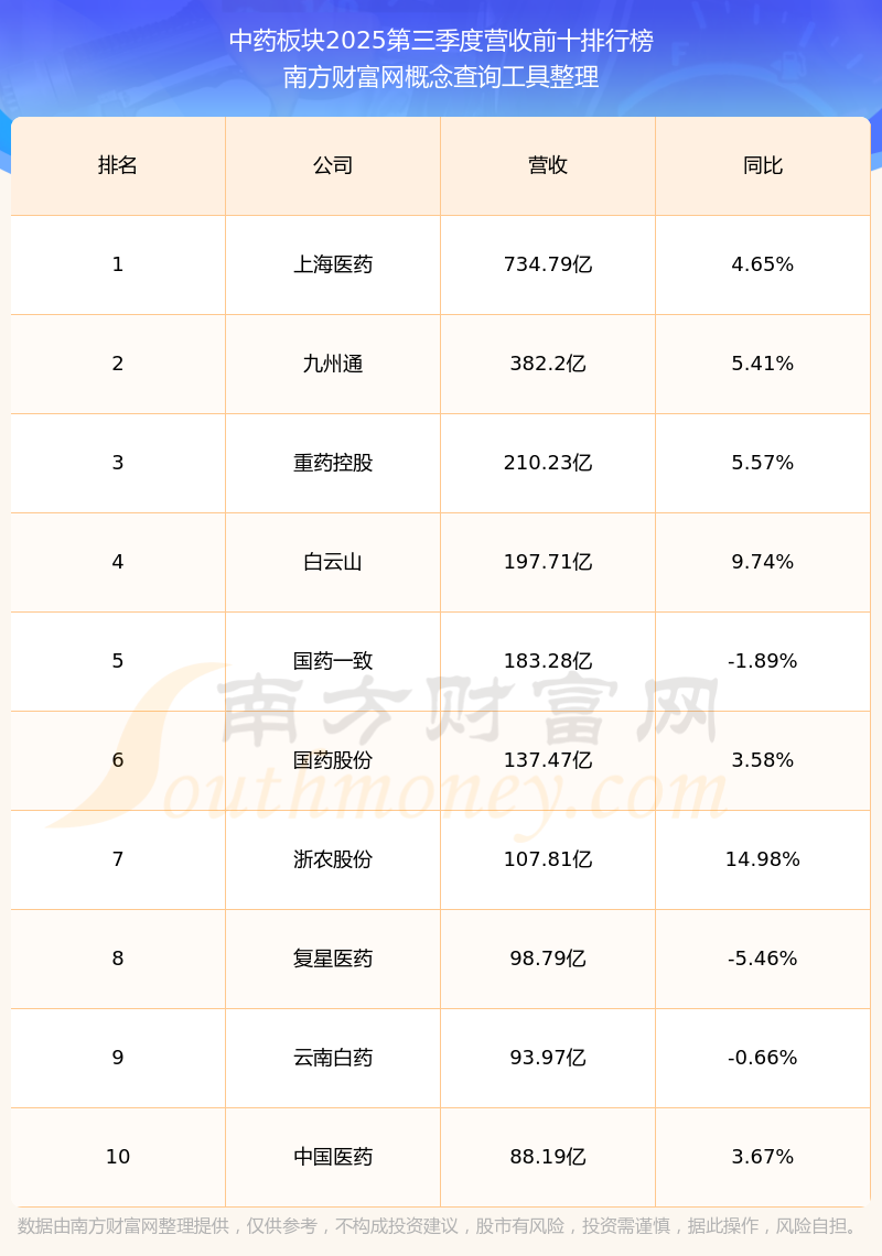 按照南方财富网概念查询工具统计,该股所属板块为中药板块,该板块共有160只股票,昆药集团2025第三季度营收在该板块中排名为第43名,该板块2025第三季度营收排名前十的股票如下表: