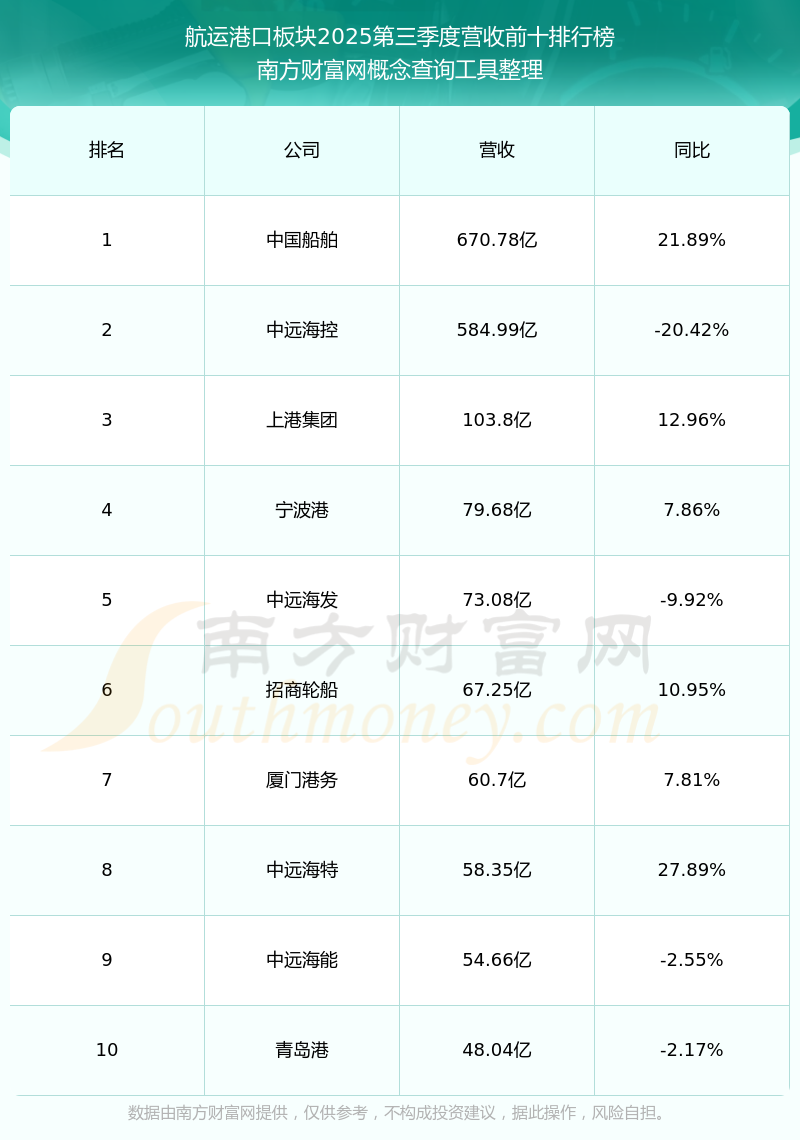 按照南方财富网概念查询工具统计,该股所属板块为航运港口板块,该板块共有40只股票,唐山港2025第三季度营收在该板块中排名为第23名,该板块2025第三季度营收排名前十的股票如下表: