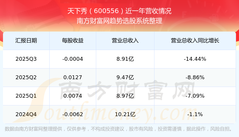 于2025年第三季度,天下秀披露了其业绩表现,其中主营业务收入8.91亿元,相较于去年同期-14.44%。此外,公司归属于母公司的净利润为-72.29万元,同比增长了-103.55%。在扣除所有非经常性损益后,净利润110.95万元,同比增长-93.28%。