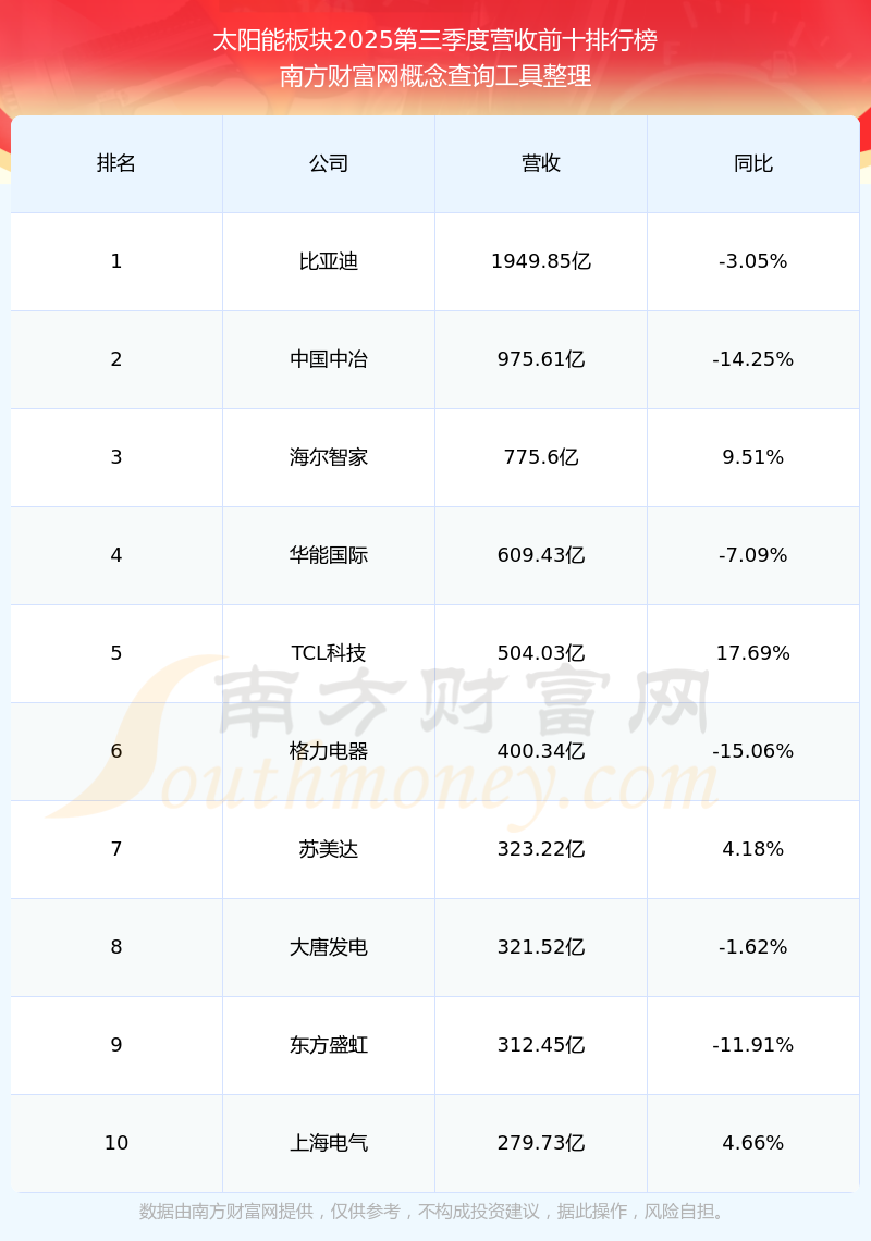 按照南方财富网概念查询工具统计,该股所属板块为太阳能板块,该板块共有448只股票,国电南瑞2025第三季度营收在该板块中排名为第26名,该板块2025第三季度营收排名前十的股票如下表: