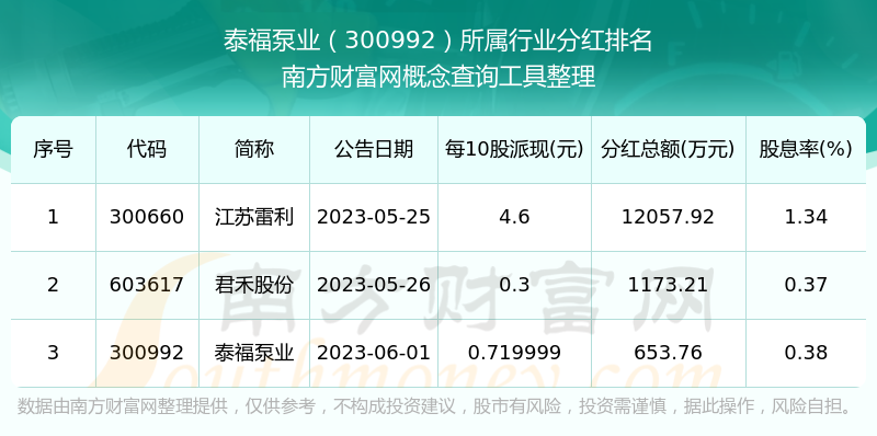 按照南方财富网趋势选股系统统计,泰福泵业所属行业为泵行业,泵行业分红排名情况如下表: