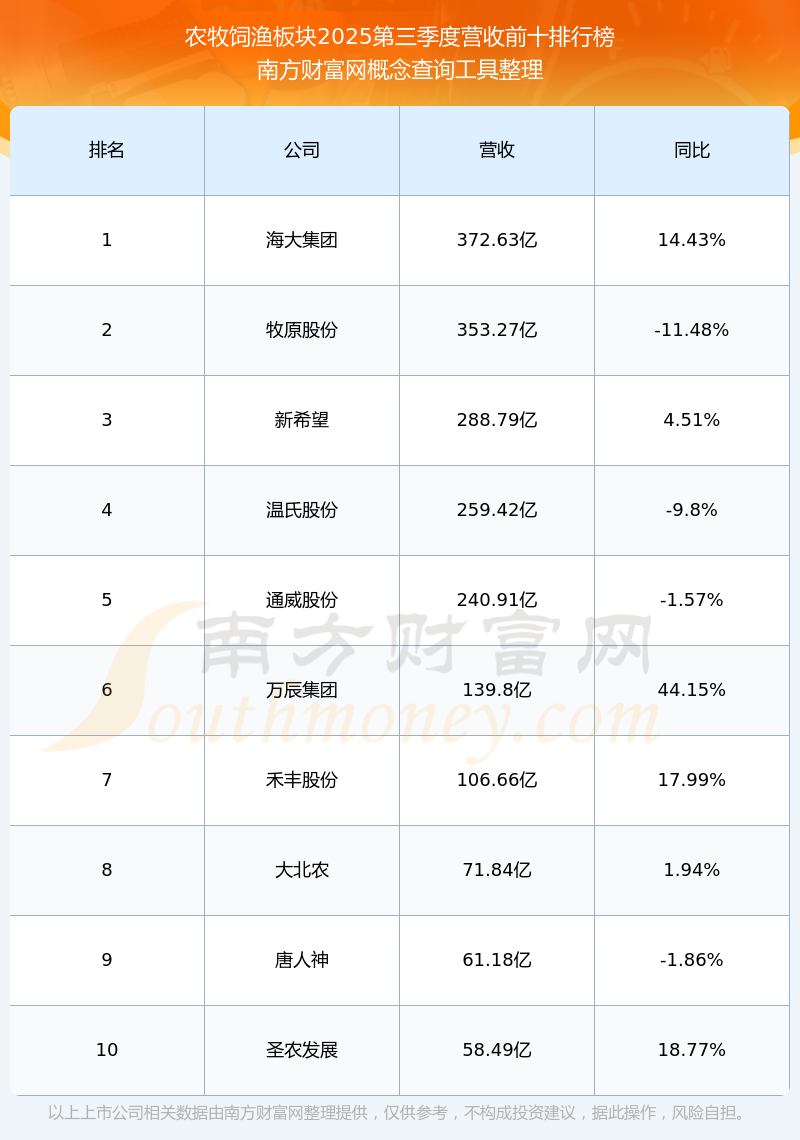 按照南方财富网概念查询工具统计,该股所属板块为农牧饲渔板块,该板块共有78只股票,大湖股份2025第三季度营收在该板块中排名为第67名,该板块2025第三季度营收排名前十的股票如下表: