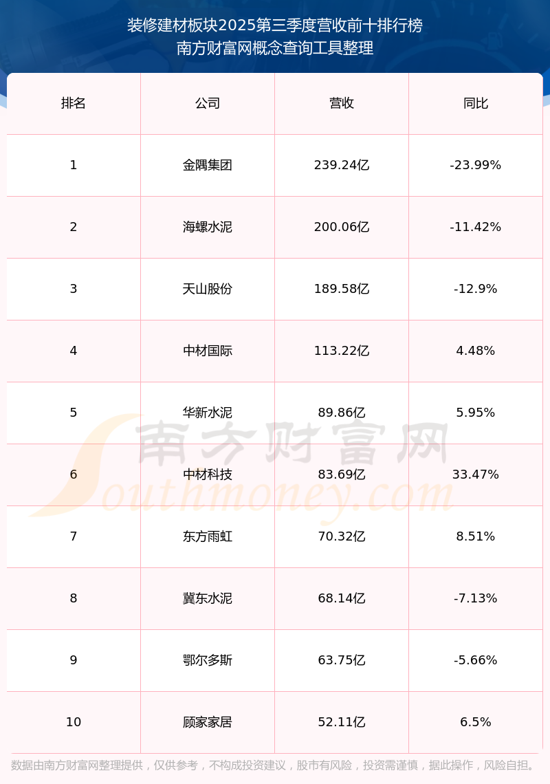 按照南方财富网概念查询工具统计,该股所属板块为装修建材板块,该板块共有82只股票,康欣新材2025第三季度营收在该板块中排名为第82名,该板块2025第三季度营收排名前十的股票如下表: