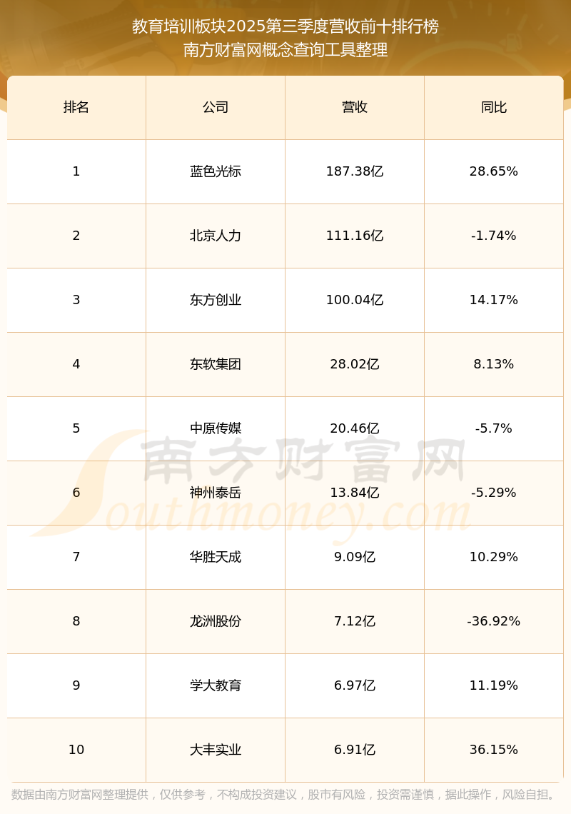 按照南方财富网概念查询工具统计,该股所属板块为教育培训板块,该板块共有58只股票,昂立教育2025第三季度营收在该板块中排名为第16名,该板块2025第三季度营收排名前十的股票如下表: