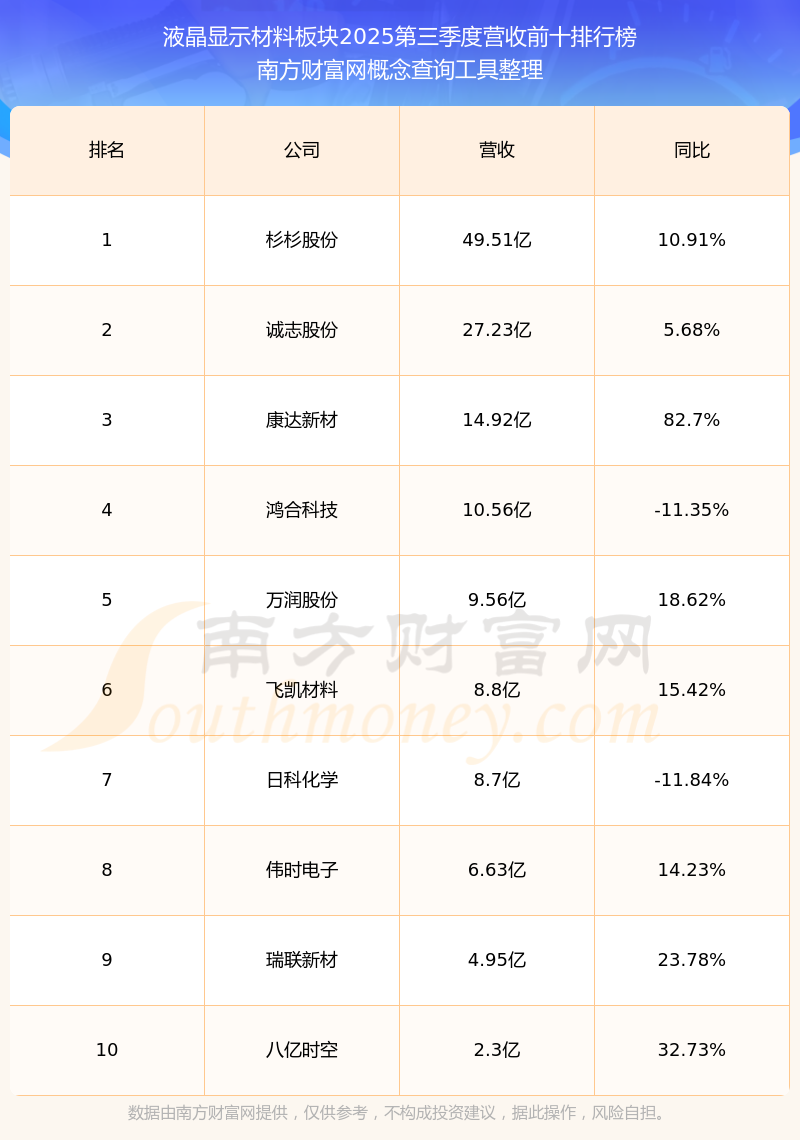按照南方财富网概念查询工具统计,该股所属板块为液晶显示材料板块,该板块共有12只股票,瑞联新材2025第三季度营收在该板块中排名为第9名,该板块2025第三季度营收排名前十的股票如下表: