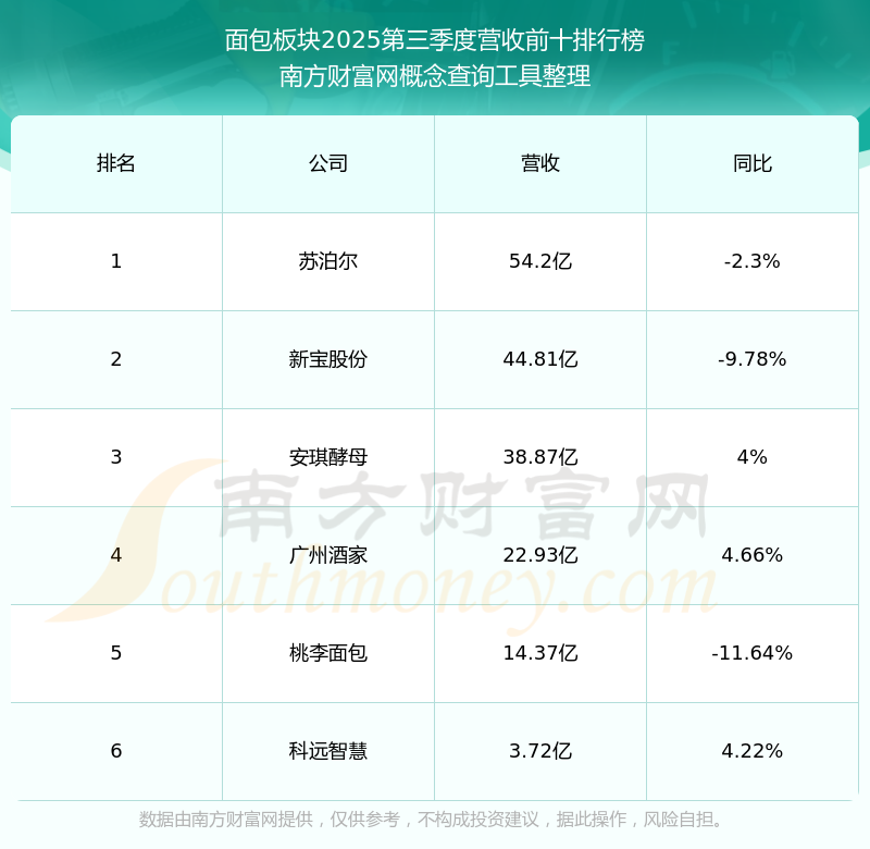 按照南方财富网概念查询工具统计,该股所属板块为面包板块,该板块共有6只股票,桃李面包2025第三季度营收在该板块中排名为第5名,该板块2025第三季度营收排名前十的股票如下表: