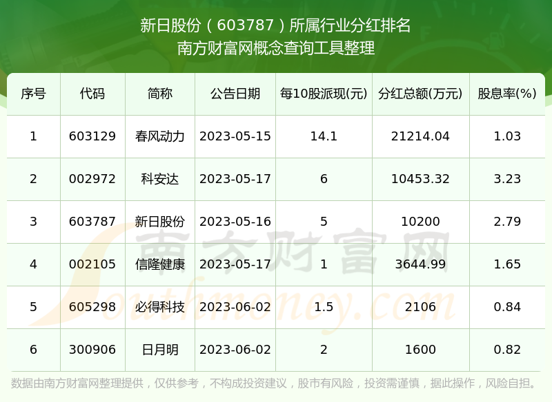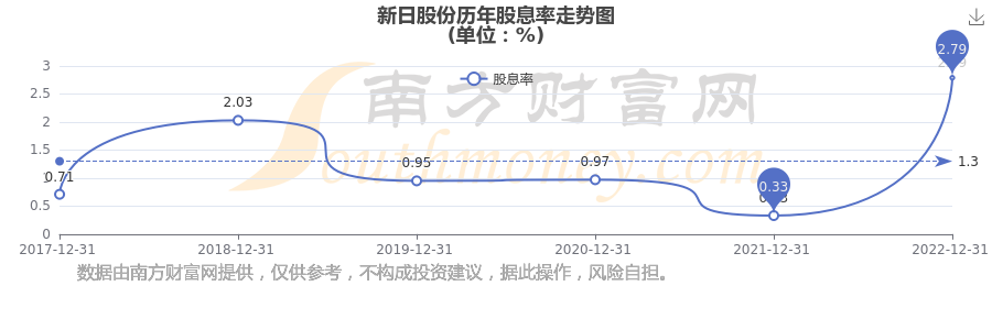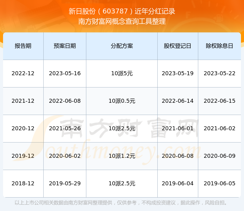 新日股份最新一次公布的分红方案为10派5元。本次权益分派股权登记日为2023年5月19日,除权除息日为2023年5月22日,派息日为2023年5月22日。
