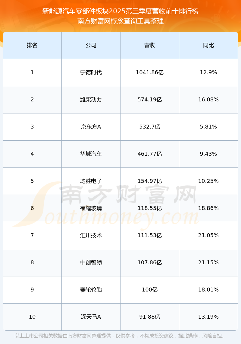 按照南方财富网概念查询工具统计,该股所属板块为新能源汽车零部件板块,该板块共有155只股票,巨一科技2025第三季度营收在该板块中排名为第155名,该板块2025第三季度营收排名前十的股票如下表: