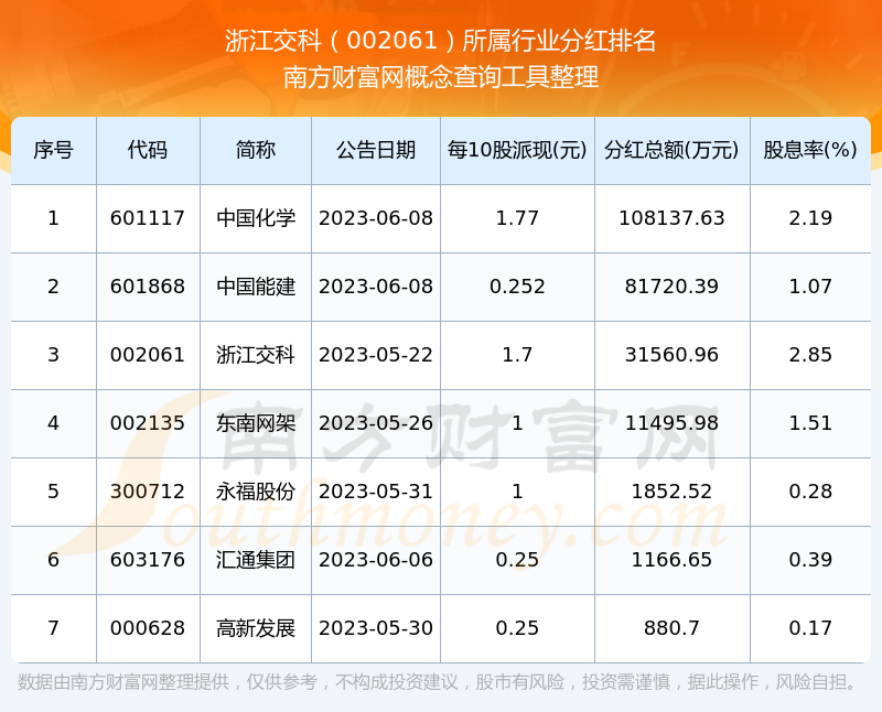 按照南方财富网趋势选股系统统计,浙江交科所属行业为工程建设行业,工程建设行业分红排名情况如下表: