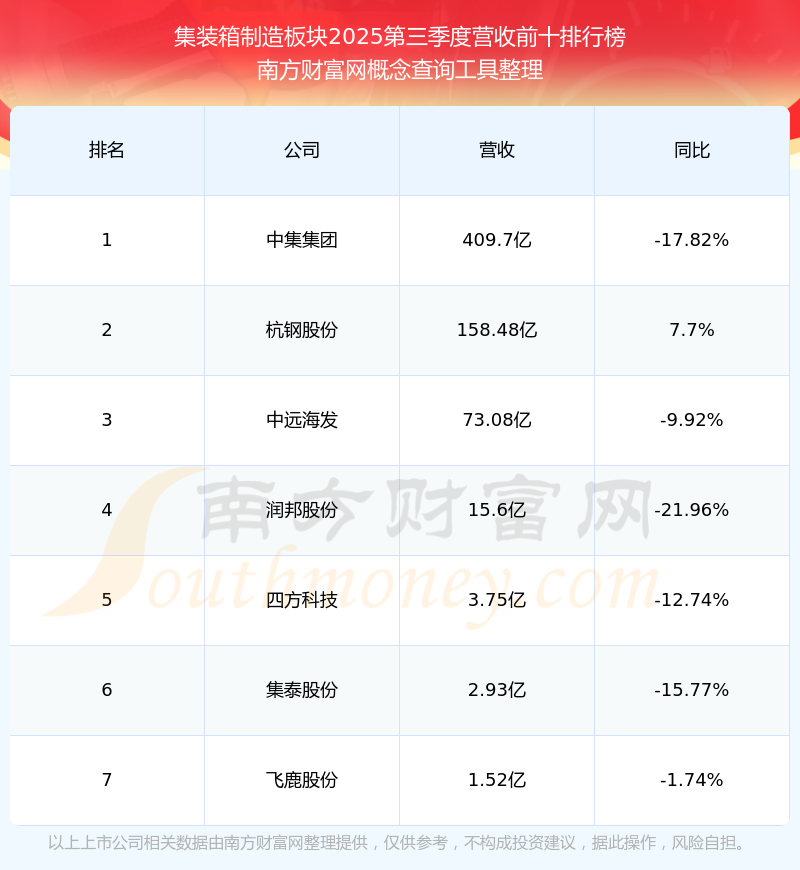 按照南方财富网概念查询工具统计,该股所属板块为集装箱制造板块,该板块共有7只股票,中远海发2025第三季度营收在该板块中排名为第3名,该板块2025第三季度营收排名前十的股票如下表: