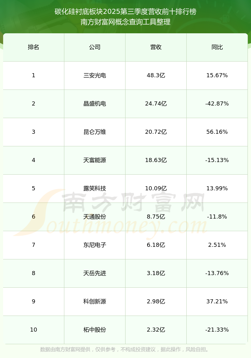 按照南方财富网概念查询工具统计,该股所属板块为碳化硅衬底板块,该板块共有11只股票,天岳先进2025第三季度营收在该板块中排名为第8名,该板块2025第三季度营收排名前十的股票如下表: