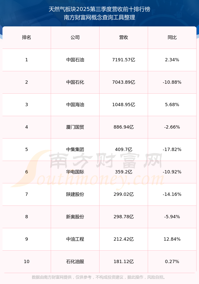 按照南方财富网概念查询工具统计,该股所属板块为天然气板块,该板块共有155只股票,皖天然气2025第三季度营收在该板块中排名为第64名,该板块2025第三季度营收排名前十的股票如下表: