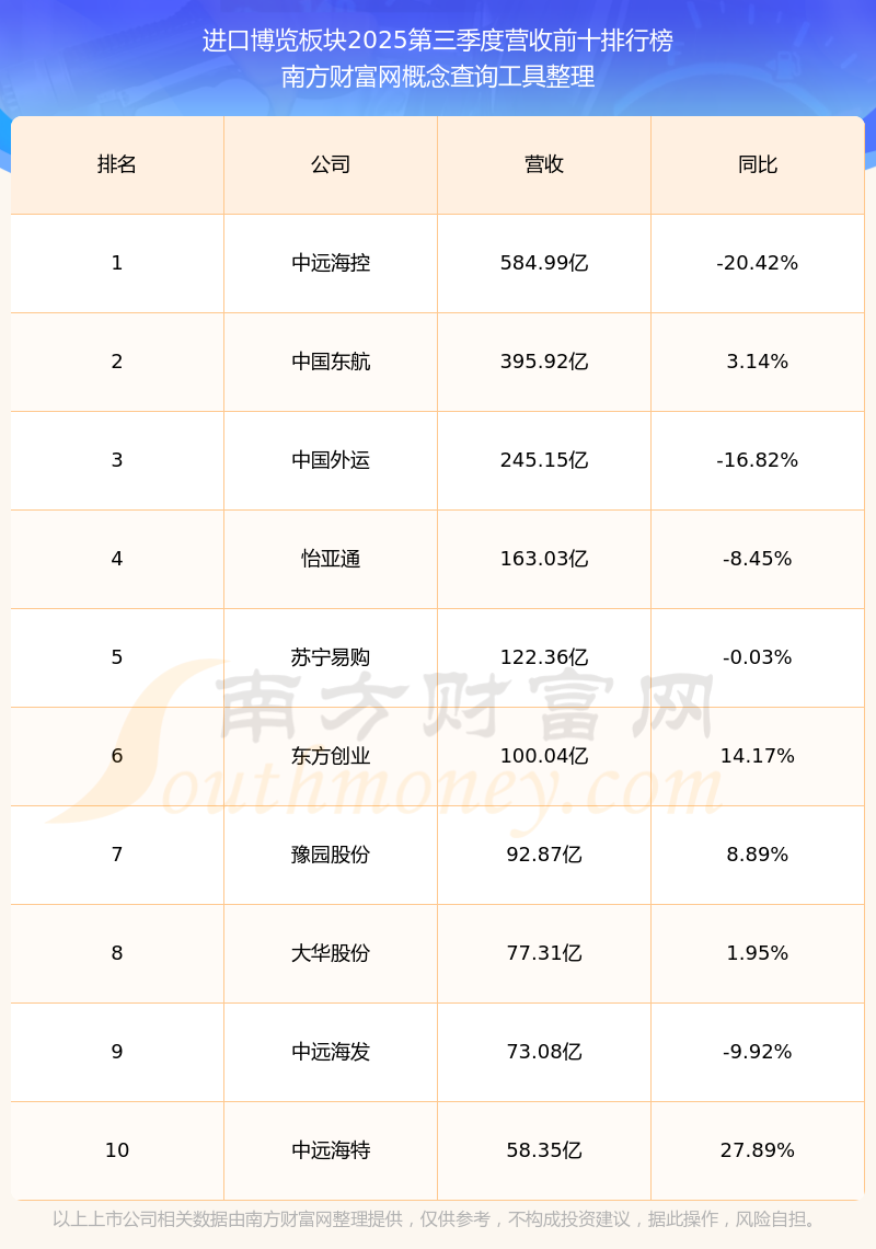 按照南方财富网概念查询工具统计,该股所属板块为进口博览板块,该板块共有28只股票,东方创业2025第三季度营收在该板块中排名为第6名,该板块2025第三季度营收排名前十的股票如下表: