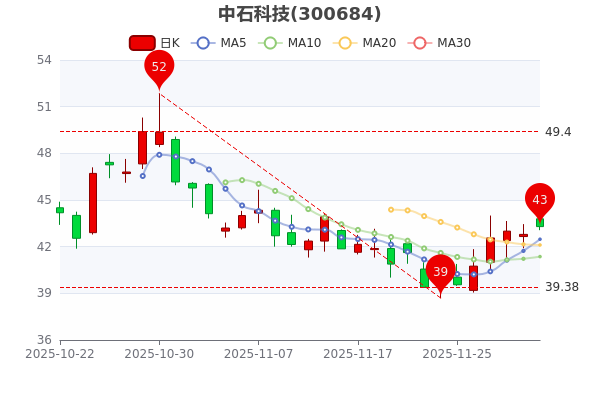 12月2日收盘消息,中石科技最新报43.290元,成交量2337.8万手,总市值为129.66亿元。