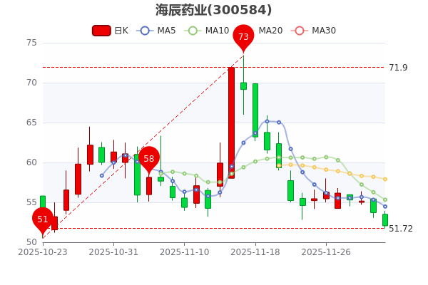 11月28日消息,海辰药业开盘报价55.97元,收盘于52.060元。5日内股价下跌7.88%,总市值为62.47亿元。