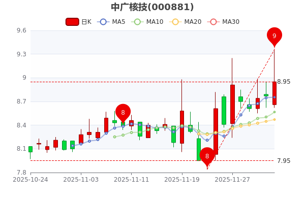 12月4日,中广核技开盘报8.66元,截至11时50分,该股涨2.05%,报价为8.950元,当日最高价为9.36元。换手率4.57%,市盈率为-23.36,7日内股价上涨1.82%。